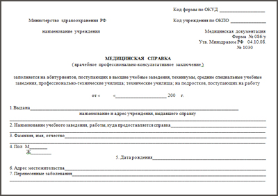 Медсправка образца 086/у предназначается для предоставления в высшие учебные заведения. Делать это должны все без исключения абитуриенты, претендующие на поступление, чтобы продемонстрировать общее состояние своего здоровья. После оформления у доктора этот документ нужно отнести в ВУЗ не позднее, чем через полгода, иначе его срок истечет.